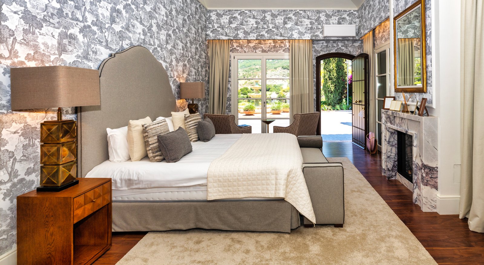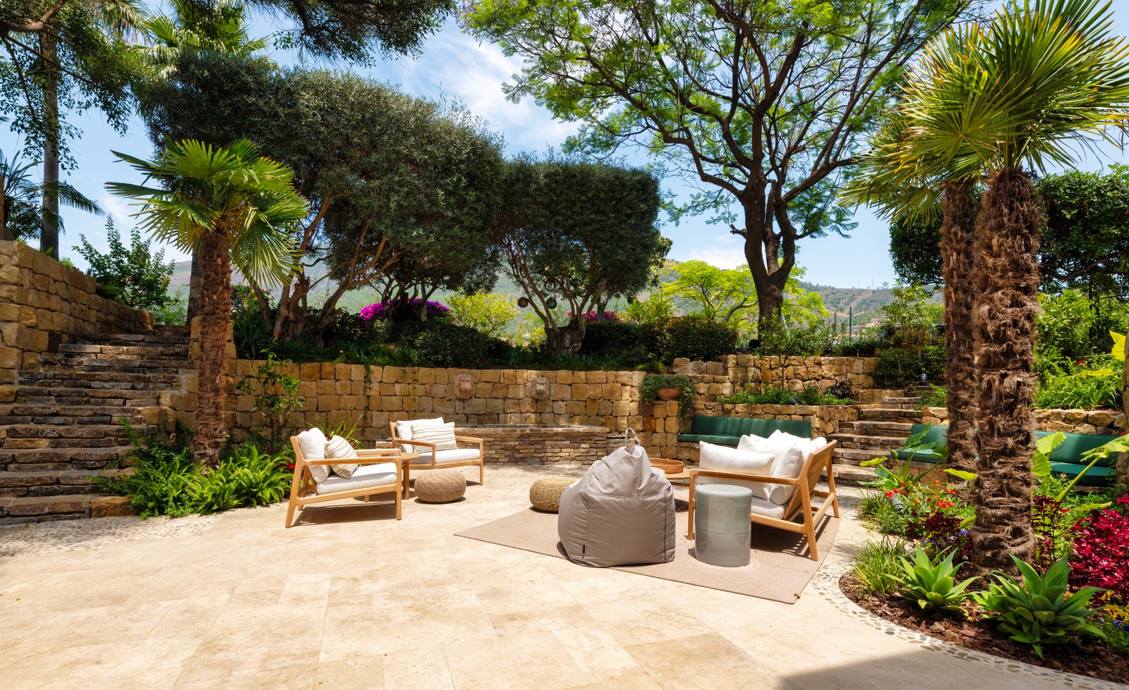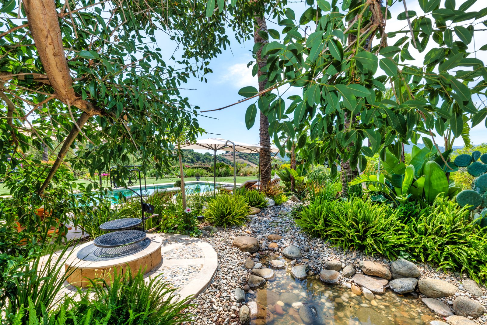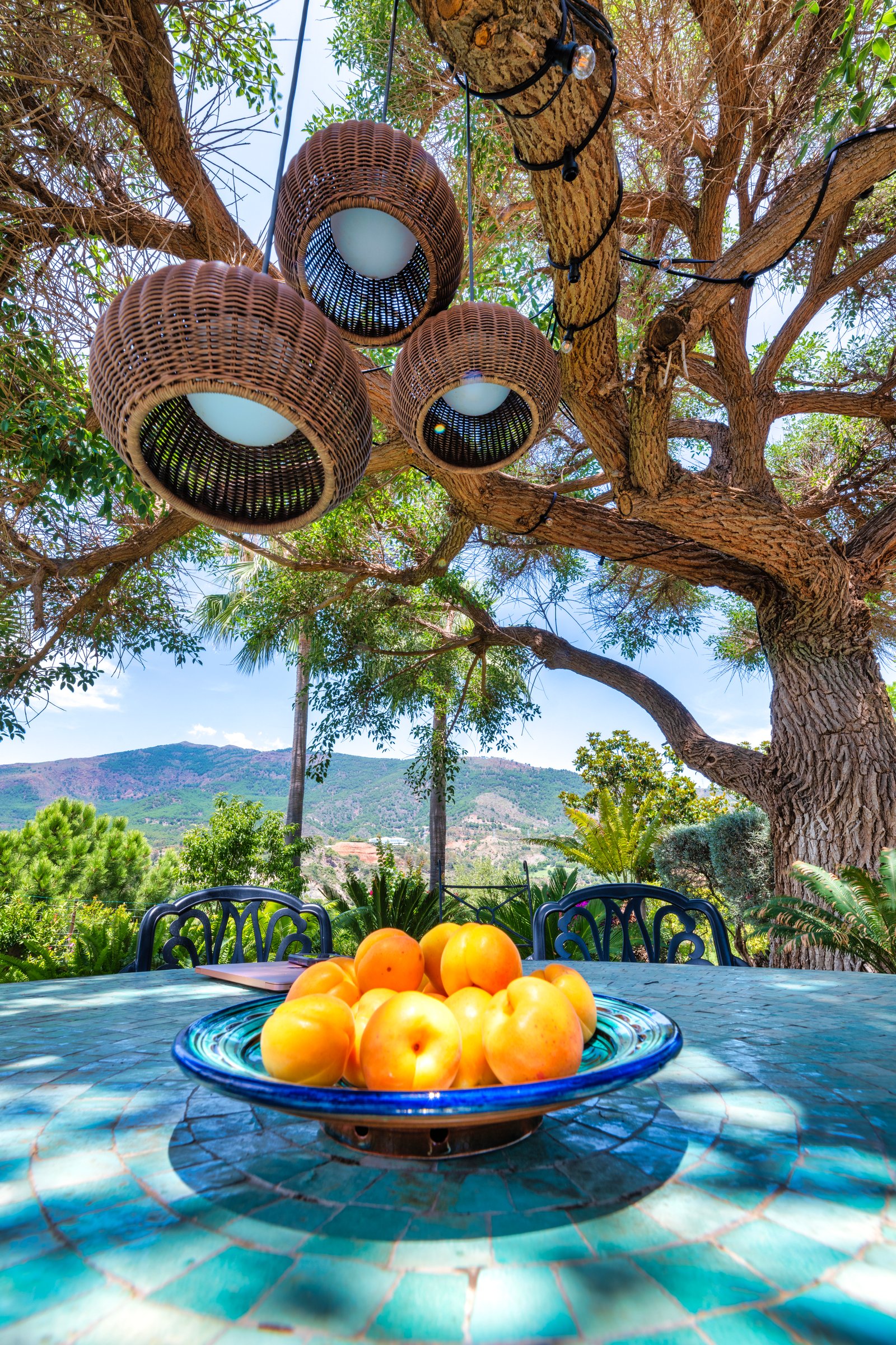 The property’s entrance with its wonderful central fountain looks especially magical when illuminated at night. Inside, the layout of the villa is arranged over 3 floors with large open-plan style living areas connecting spaces together. There are 2 complete kitchens within the main house which lends itself well to a multigenerational group that wants to prepare different meals and different times. Outside, the grounds invite peace and serenity, featuring a magnificent pool, fountains and a multitude of fruit trees.