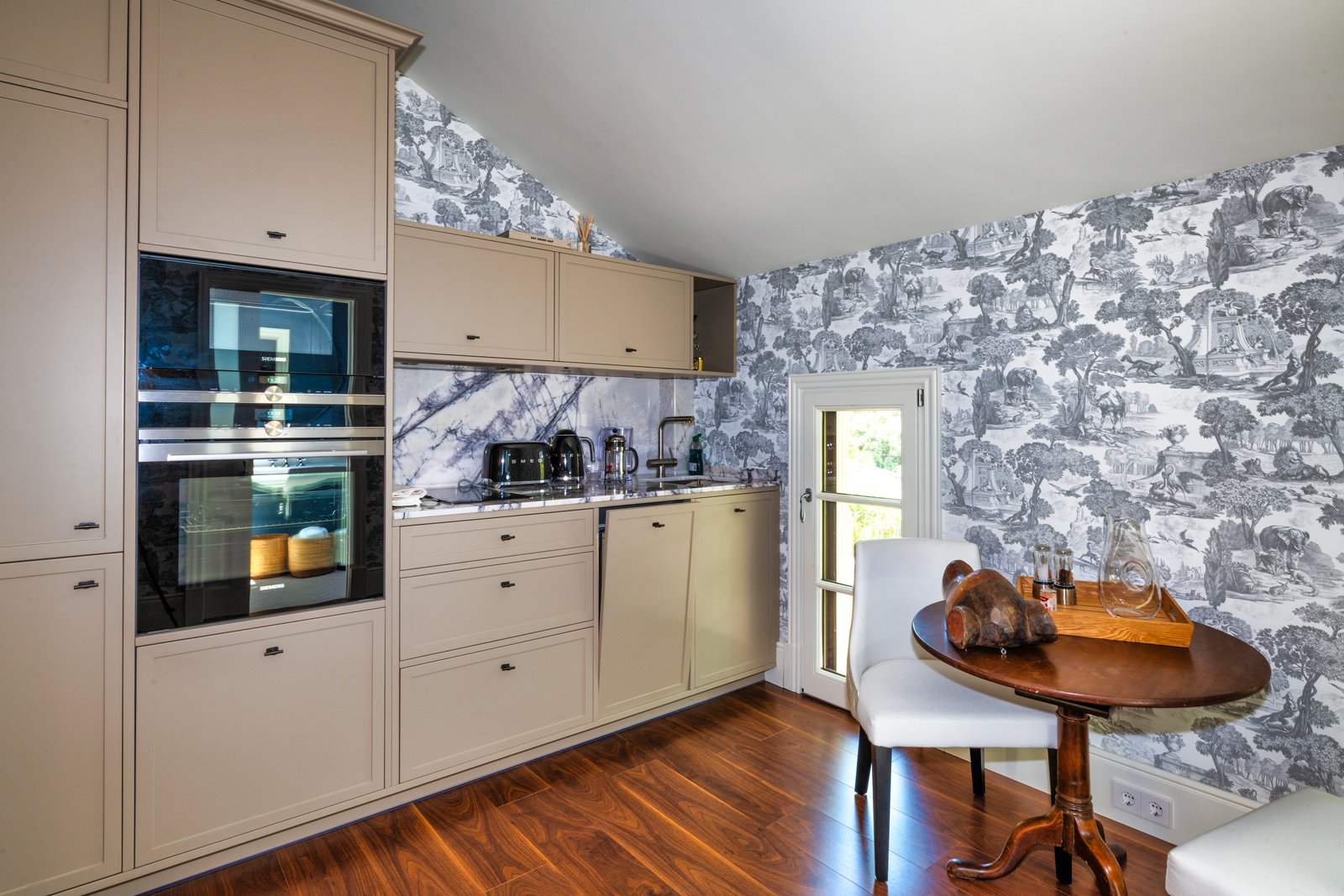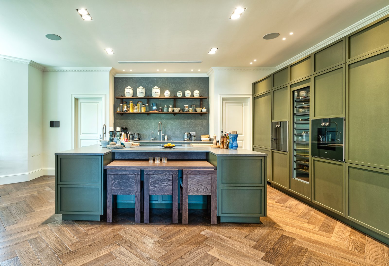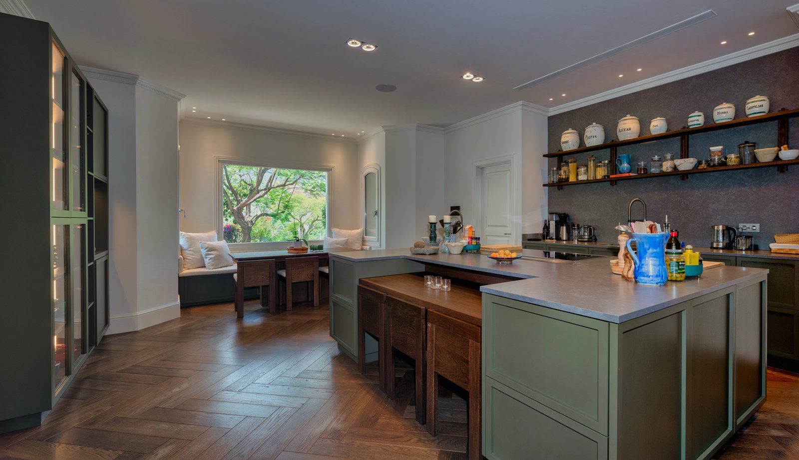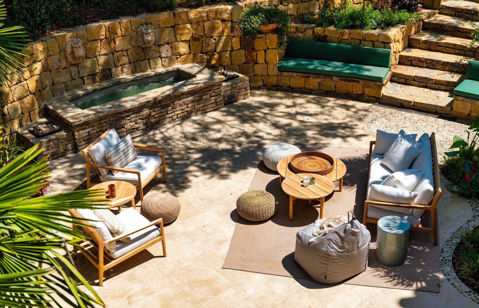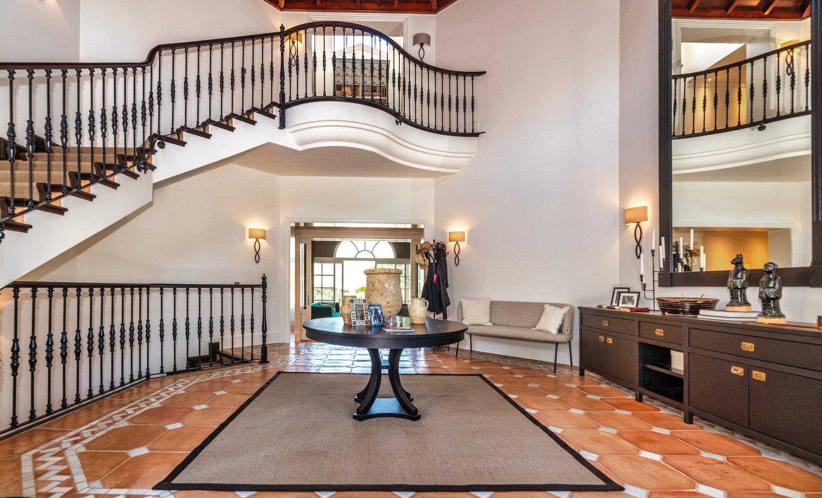 The property’s entrance with its wonderful central fountain looks especially magical when illuminated at night. Inside, the layout of the villa is arranged over 3 floors with large open-plan style living areas connecting spaces together. There are 2 complete kitchens within the main house which lends itself well to a multigenerational group that wants to prepare different meals and different times. Outside, the grounds invite peace and serenity, featuring a magnificent pool, fountains and a multitude of fruit trees.