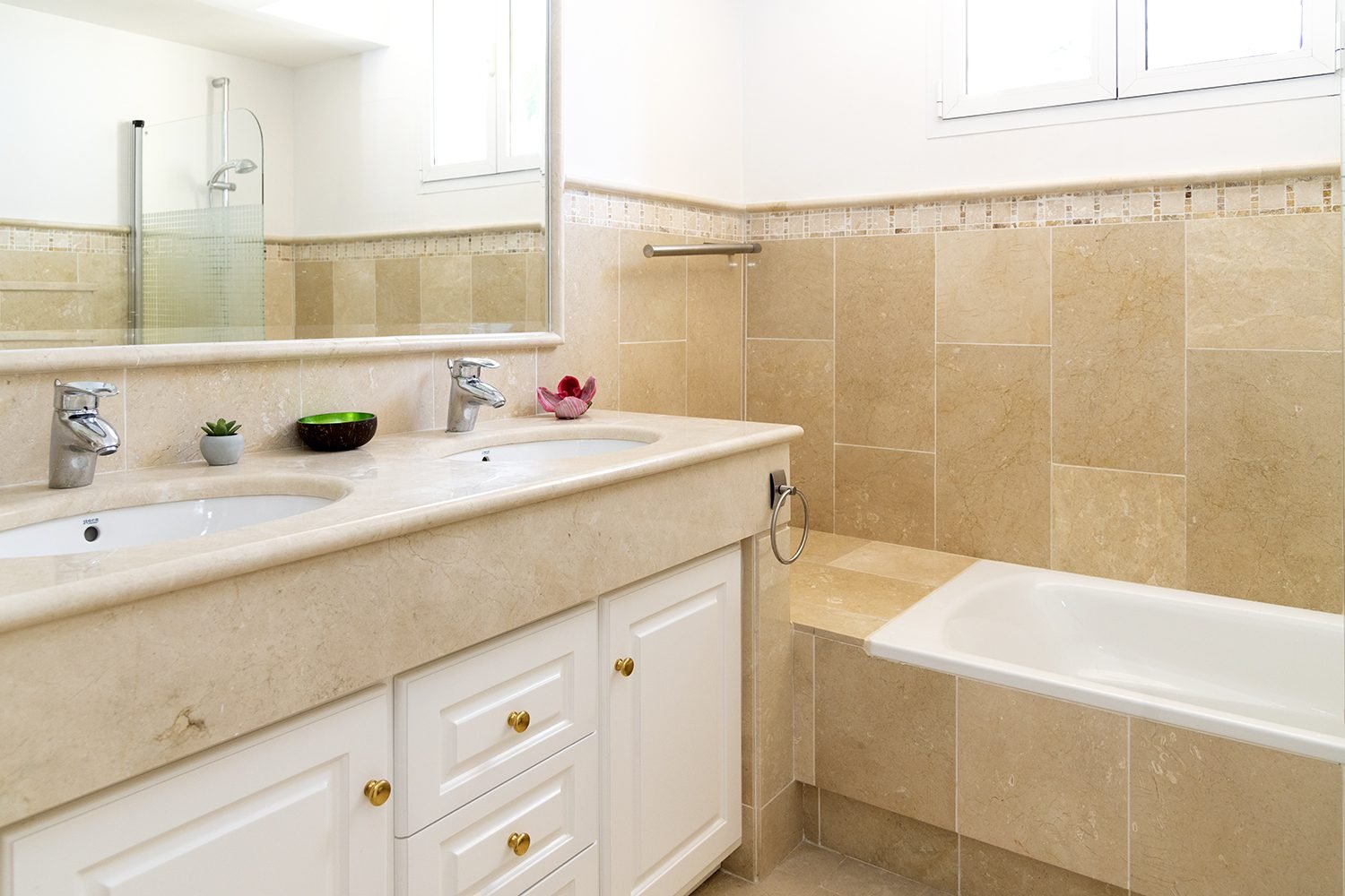 Upstairs you find both a double guest room and the impressive master bedroom with its own private terrace and large en suite bathroom including a walk-in shower and divine bathtub.
