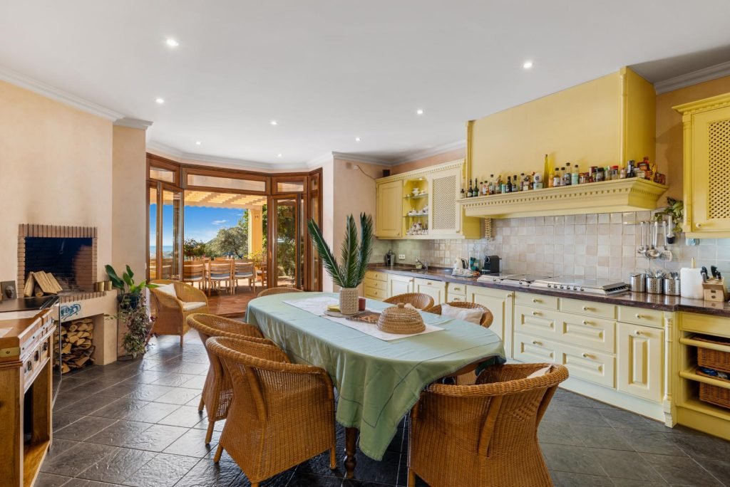 The kitchen is vast and fully equipped, with a breakfast table and an open fireplace. There is direct access to the main terrace.