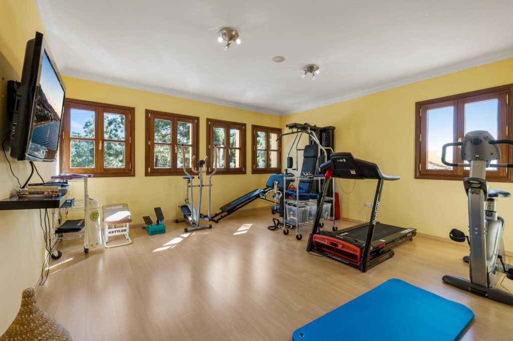 There is a fantastic gym room, with an array of equipment, a sauna, and various sunbeds on the upper terrace.